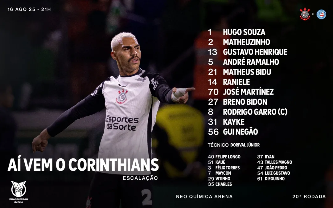 O Corinthians vem de atuações consistentes e busca manter o bom momento. Rodrigo Garro é o maestro do meio-campo e pode ser decisivo com sua criatividade. A dupla de ataque formada por Kayke e Gui Negão tem mostrado entrosamento e velocidade, o que pode ser um diferencial contra a defesa baiana.