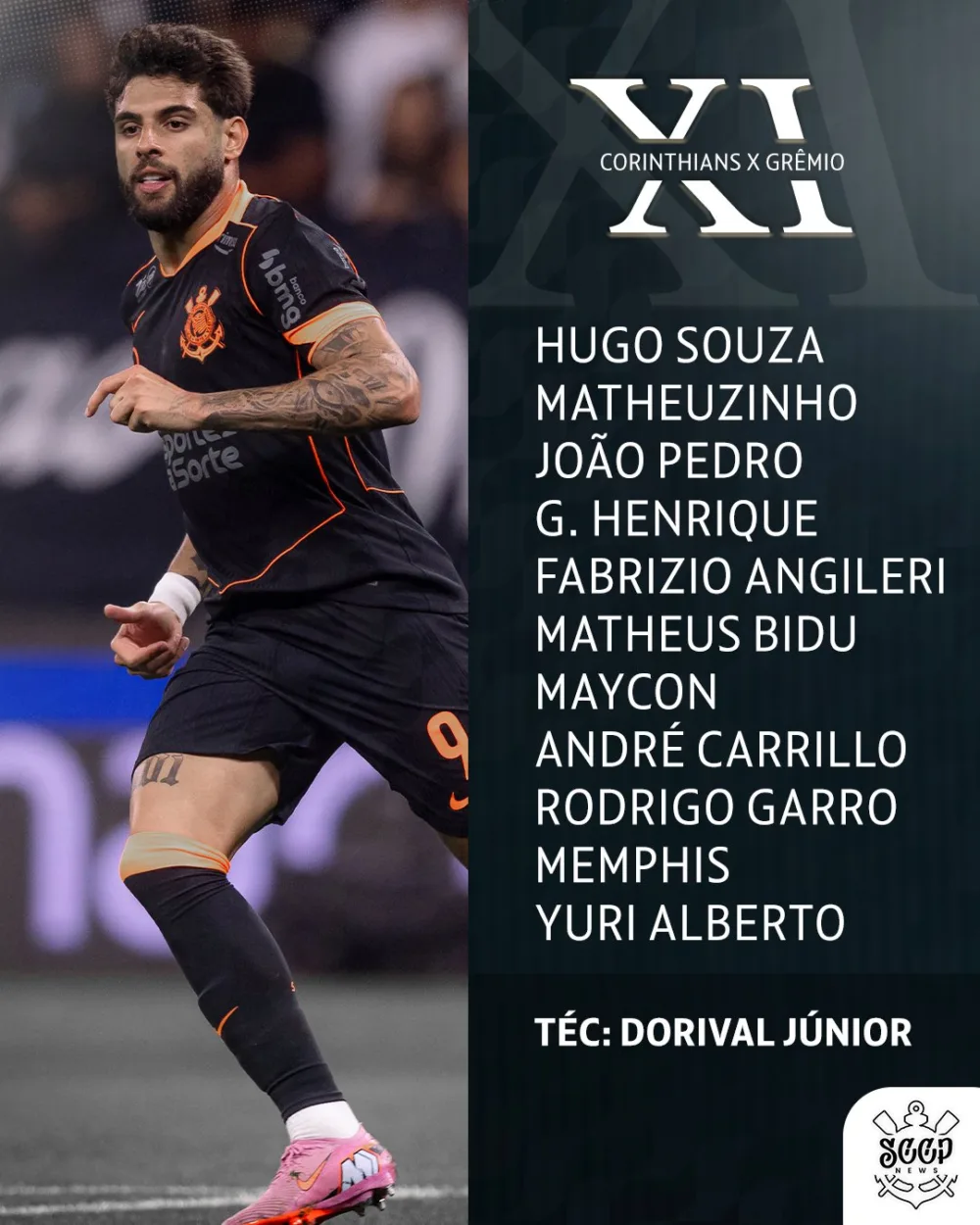 A principal novidade é o retorno do goleiro Hugo Souza, recuperado de lesão no ombro esquerdo. Além disso, Maycon volta ao time após suspensão, reforçando o meio-campo ao lado de Charles e Rodrigo Garro, enquanto Memphis Depay e Yuri Alberto formam a dupla ofensiva.