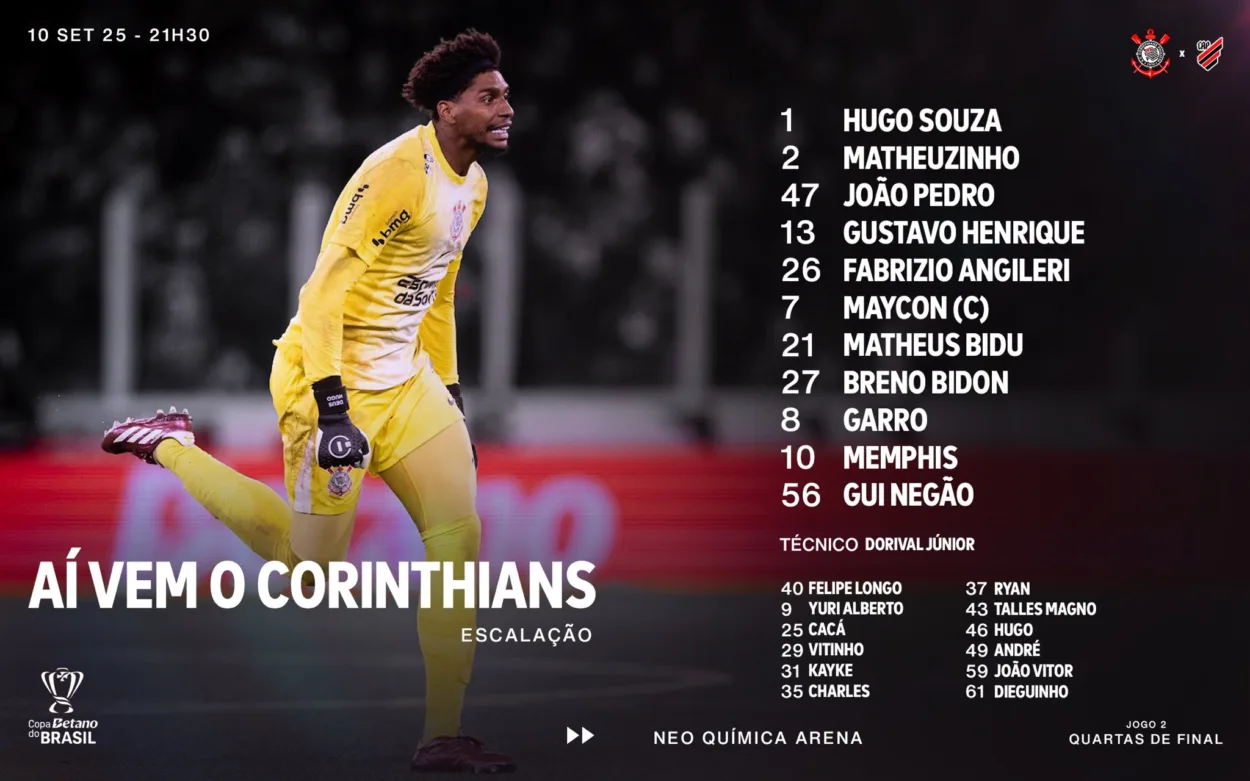 O Corinthians, por sua vez, entra em campo com força máxima. Dorival Júnior deve escalar Hugo Souza; Matheuzinho, Gustavo Henrique, André Ramalho e Matheus Bidu; Maycon, Charles (José Martínez), Breno Bidon e Rodrigo Garro; Memphis Depay (Gui Negão) e Yuri Alberto.