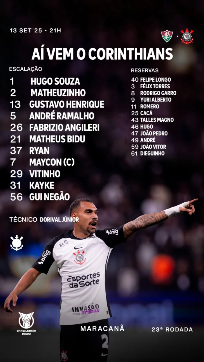 O Corinthians está escalado para enfrentar o Fluminense neste sábado (13), às 21h, no estádio do Maracanã, pela 23ª rodada do Campeonato Brasileiro. O técnico Dorival Júnior terá que lidar com uma série de desfalques, incluindo o atacante Memphis Depay, que sofreu um edema na coxa e está em recuperação com o departamento médico.