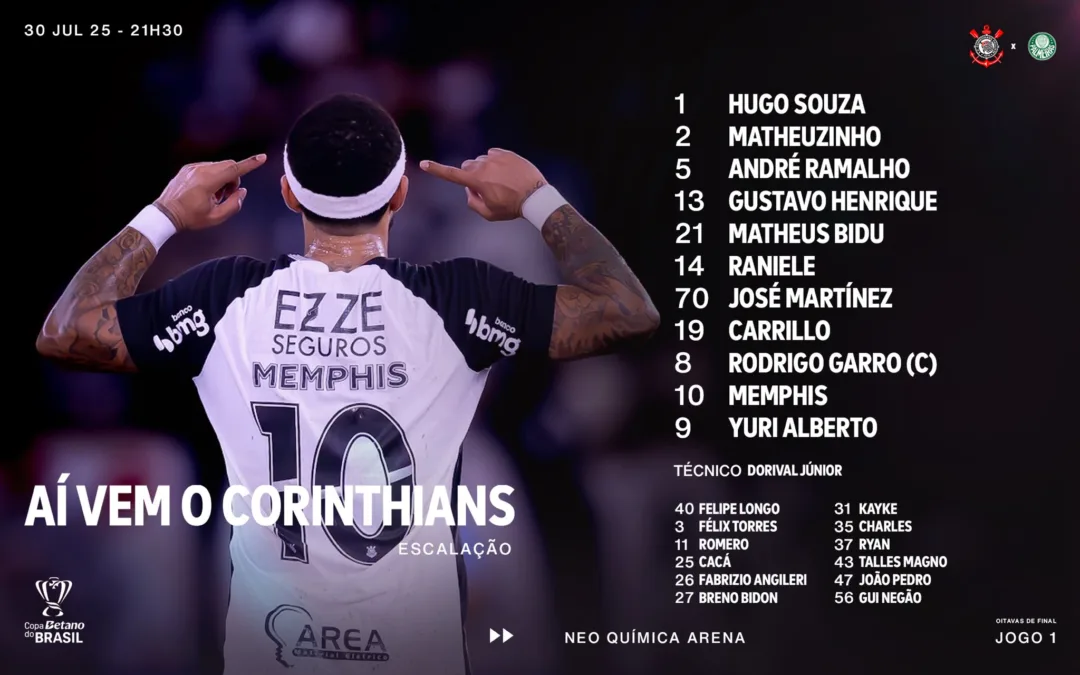 Muito mais que um clássico estadual, o duelo representa uma etapa decisiva na briga pelo título. Corinthians e Palmeiras chegam com campanhas distintas, mas ambos dispostos a colocar tudo em campo. O Corinthians, ainda buscando o equilíbrio sob o comando de Dorival Júnior, aposta na mistura de juventude e experiência.