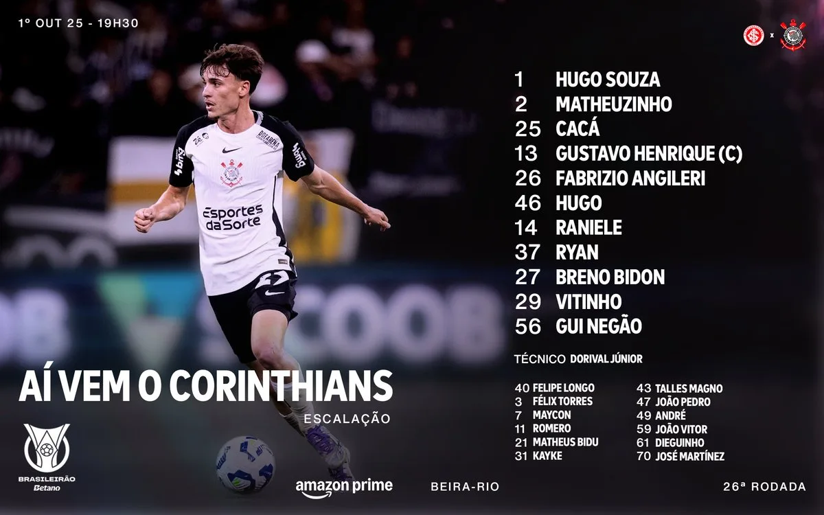 Corinthians está definido para enfrentar o Internacional, nesta quarta-feira (1º), às 19h30, no estádio Beira-Rio, pela 26ª rodada da Série A do Campeonato Brasileiro. Pressionado após a derrota para o Flamengo, o técnico Dorival Júnior promoveu mudanças no time titular, especialmente no ataque, devido a desfalques importantes.