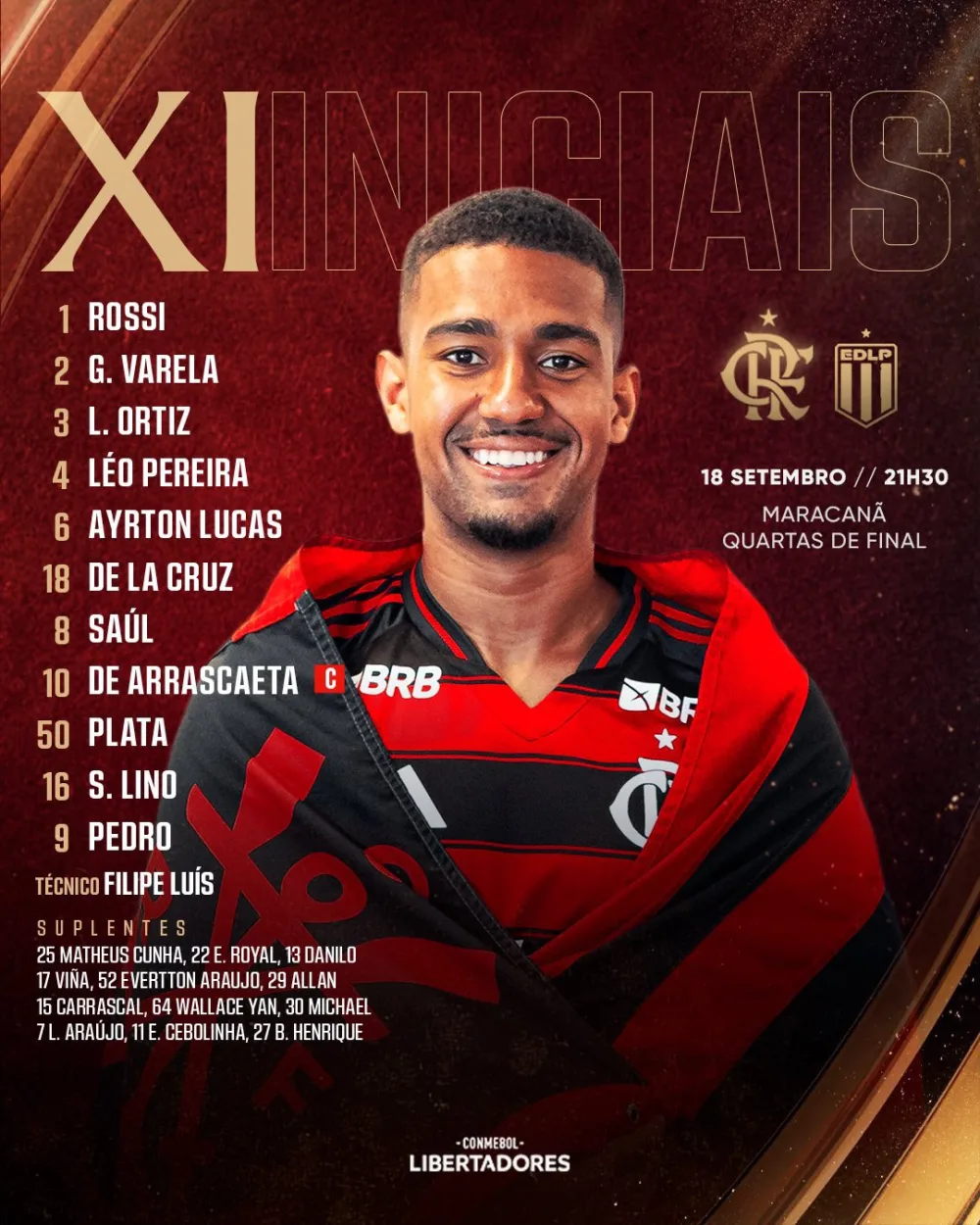Filipe Luís optou por escalar o que tem de melhor. Bruno Henrique, que retorna de dores musculares, começa no banco. Já Varela e Léo Ortiz voltam ao time após recuperação física e suspensão, respectivamente. No meio, De la Cruz ganha nova chance após boas atuações nos treinos.
