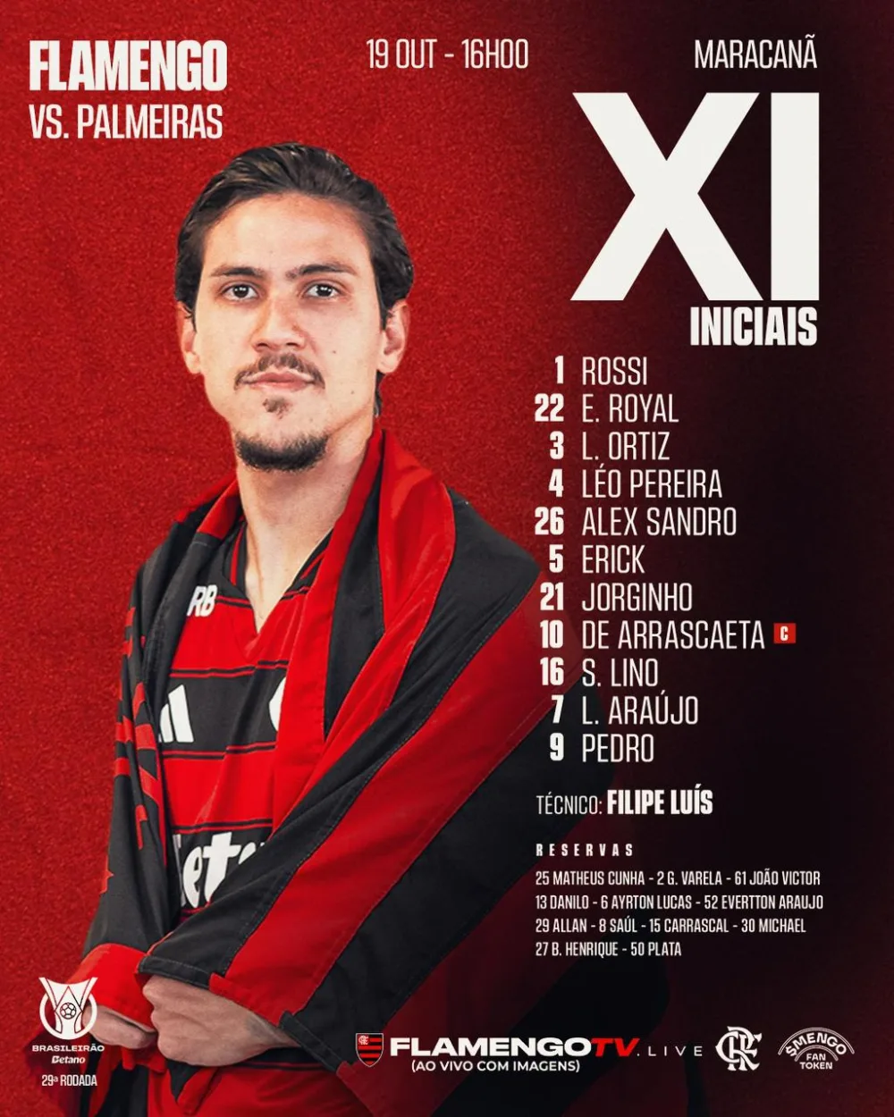 time rubro-negro mantém a base utilizada nas últimas rodadas, com destaque para Pedro, que volta a ser titular após bom desempenho no último jogo, e Samuel Lino, que segue ganhando sequência no ataque.