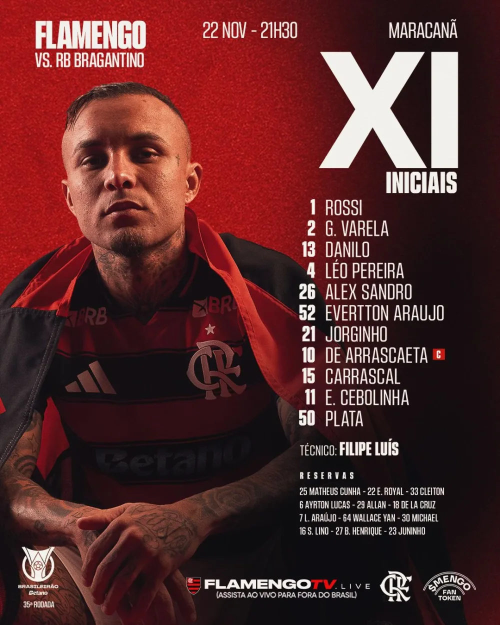 O Flamengo está escalado para encarar o Red Bull Bragantino neste sábado (22), às 21h30, no Maracanã, pela 35ª rodada do Campeonato Brasileiro. O técnico Filipe Luís promoveu mudanças e aposta em Rossi no gol, além de novidades no ataque. O Rubro-Negro busca manter a liderança da competição diante de um adversário direto na briga por vaga na Libertadores. A expectativa é de casa cheia no Maracanã. O duelo promete intensidade e equilíbrio na reta final da Série A.
