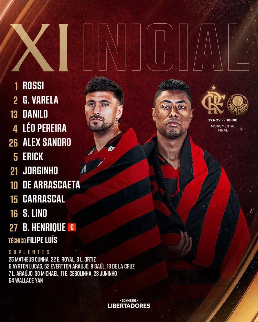 A escalação confirmada traz: Rossi; Varela, Léo Ortiz, Léo Pereira e Alex Sandro; Pulgar, Jorginho e Arrascaeta; Luiz Araújo, Carrascal e Bruno Henrique. O esquema oferece mobilidade pelos lados, presença ofensiva constante e criação pelo meio, com Arrascaeta como cérebro e Carrascal dando profundidade entre as linhas. Bruno Henrique, decisivo em jogos grandes, mantém protagonismo no ataque.