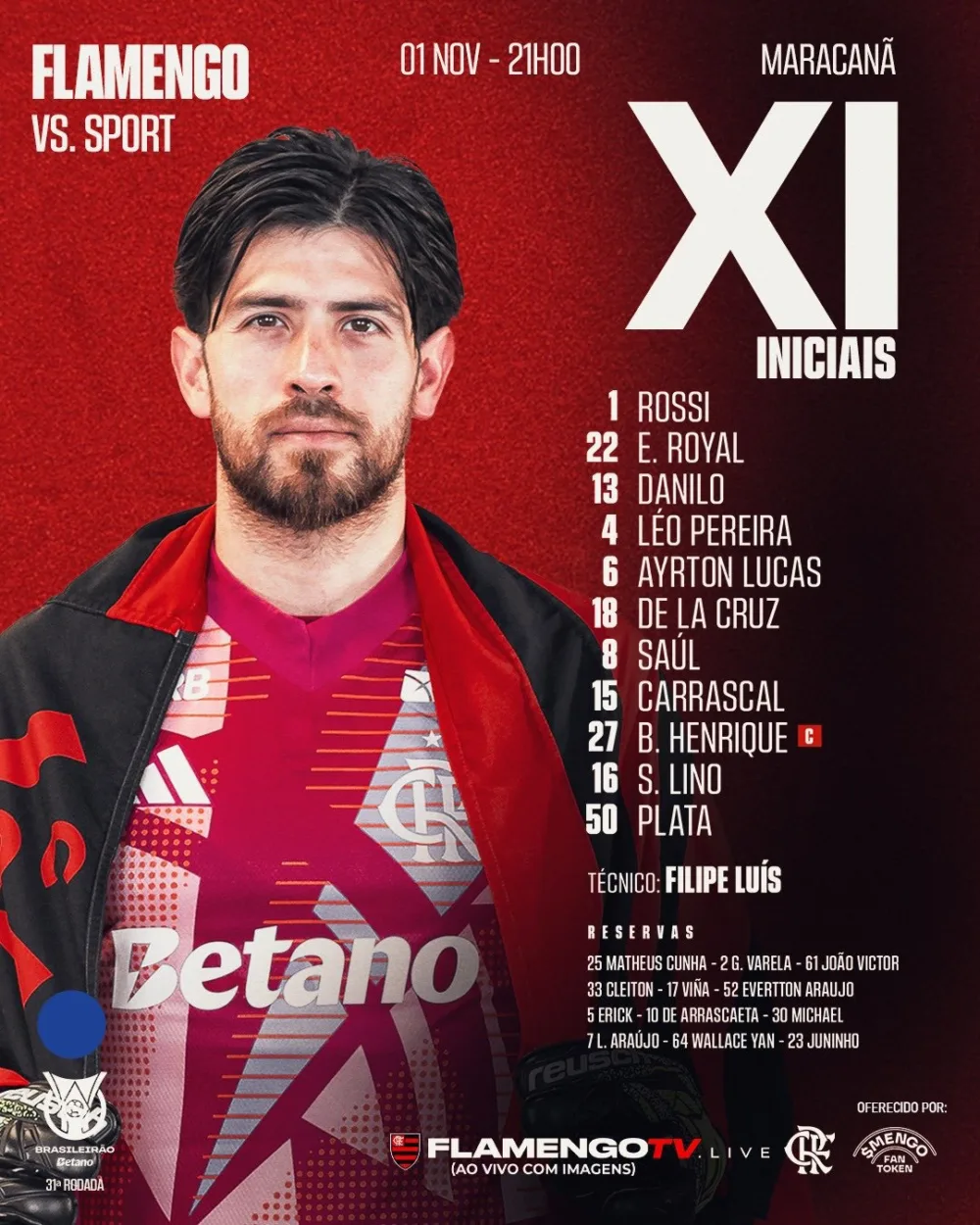 A equipe será completada com De La Cruz, Arrascaeta, Samuel Lino, Plata e Carrascal, mantendo o estilo ofensivo que o treinador vem implementando desde sua chegada.