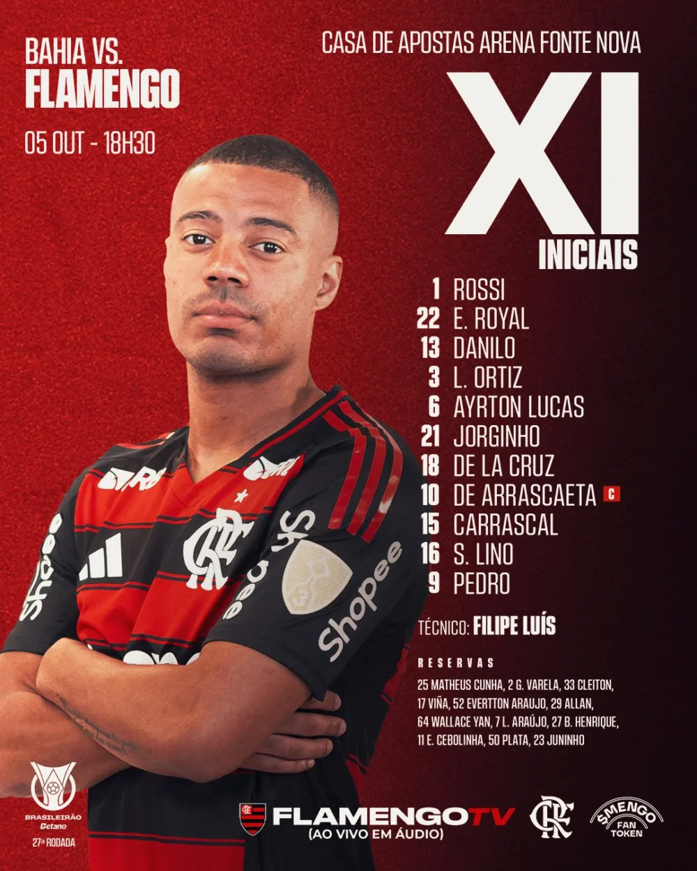 O CRF entra em campo com o tradicional 4-3-3 ofensivo, tendo Arrascaeta como cérebro criativo e Pedro como referência na área. A dupla, responsável por quase metade dos gols do time no Brasileirão, volta a atuar junta desde o início.